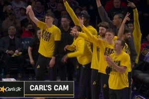 潇洒!詹姆斯空位三分一箭穿心 替补席集体起立欢庆