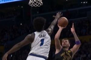 高难度!东契奇持球连续晃动 突进篮下对抗防守后仰单手抛进