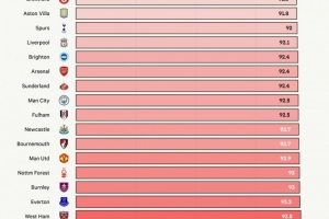 Opta超级计算机列英超剩余赛程难易度榜单(数值越高越难)