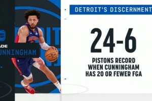 上一场26中5!坎宁安本赛季出手不超20次 活塞战绩为24-6