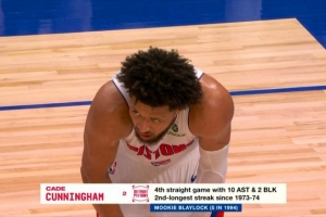 坎宁安连续4场至少10助2帽 联盟73-74赛季至今第2长&仅次布雷洛克
