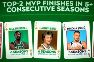 历史仅三位球员连续5个赛季MVP票选排名前二:约基奇+拉塞尔+伯德