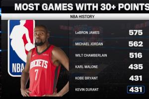 伟大的得分手!杜兰特生涯30+场次追平科比 并列历史第5!