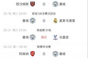 15天定赛季!曼城3月8日起战纽卡、两回合皇马、联赛杯决赛vs枪手