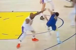 詹姆斯一次快攻两次推翻勇士球员 裁判未响哨!