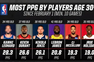 2026年30+球员场均得分榜:小卡28.3分断层领跑 KD第2老詹第4