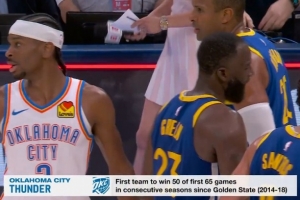 挑落你复刻你!雷霆连续两个赛季前65场揽50胜 比肩14-18赛季勇士