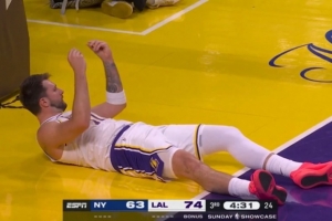 想造进攻犯规裁判没给!被撞翻在地的东契奇比出收钱手势