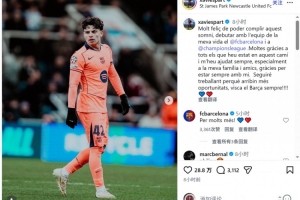 埃斯帕特社媒晒出比赛照片,并写道:“非常高兴能够实现这个梦想——在一生挚爱的巴萨上演首秀,并且是在欧冠比赛之中。
