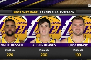 湖人队史单赛季三分命中纪录:拉塞尔226记居首 本赛季东契奇第3