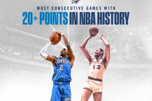 这样,亚历山大连续127场至少20分,正式超越1961-63赛季的张伯伦(126场),登顶NBA历史第一。
