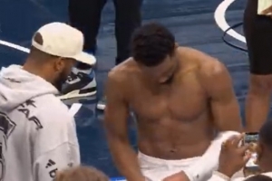 一身腱子肉!米切尔赢球后心情大好 光膀子场边互动