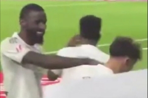 体育资讯3月15日讯 《阿斯报》晒视频,发现吕迪格在庆祝居莱尔进球时,下意识打了皮塔奇一下。