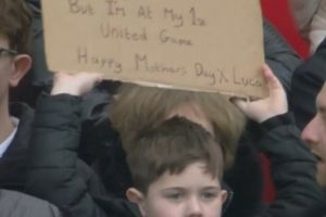 错过母亲节,小球迷举牌向母亲道歉:今天是我第一次来看曼联比赛