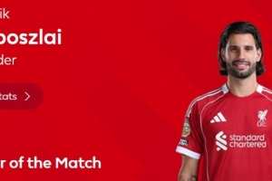 任意球破门,英超官方:索博斯洛伊当选利物浦1-1热刺全场最佳