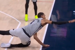 真拼啊!文班从罚球线内飞扑到边线试图完成救球 摔到观众席