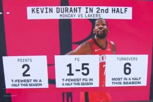 KD上场打湖人下半场仅命中1球得2分平赛季最低 6失误赛季最多!