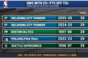 雷霆本赛季已有30场利用对手失误得到25+ 96-97赛季以来最多!