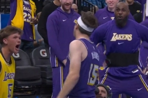 老头儿看嗨了!里夫斯暴扣引爆全场 詹姆斯怒吼+挥拳疯狂庆祝