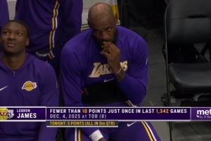 目前仅拿到5分!詹姆斯坐在场边咬手指 若有所思
