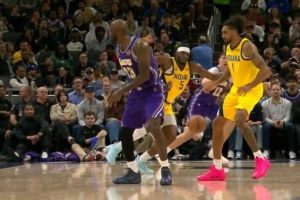 出神入化!詹姆斯写意背传精准找到拉拉维亚 助后者轻松上篮打中