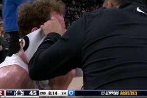 看起来超级疼!亚历山大上篮倒地后手指戳到地板 有点受伤