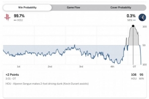 加时剩3分01秒火箭108-95领先13分&胜率高达99.7% 森林狼仅0.3%