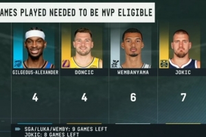 MVP候选人评奖资格:SGA&卢卡需打4场 文班6场 约基奇剩8场打7场