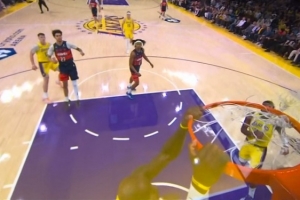 飞高高!里夫斯信手一撩送抛传 詹姆斯腾空而起双手空接暴扣
