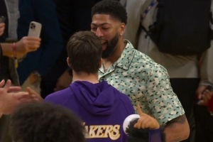 冠军功勋!赛后里夫斯&海斯找湖人旧将浓眉开心热聊