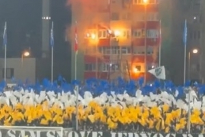 主场迎战意大利,波黑球迷在球场旁建筑物燃放焰火和烟花加油助威