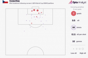 世预赛欧洲区比赛,捷克已经通过角球打进7球,位居欧洲区所有球队之首。