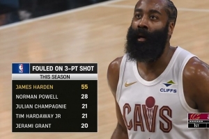 独一档!哈登本赛季55次造三分犯规联盟最多 鲍威尔28次第二