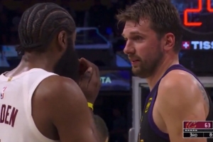 哈登和东契奇在场上愉快聊天 还捂着自己的胡子