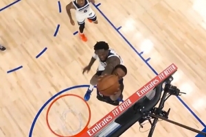 看着都疼!詹金斯突击起飞暴扣 被兰德尔击中面部但裁判无视