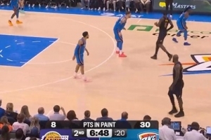 凿穿内线!雷霆油漆区得分30分 湖人全队仅28分