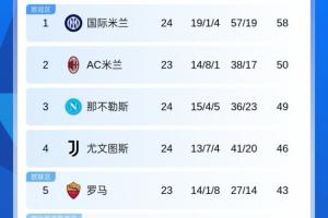意甲积分榜:国米先赛领先AC米兰8分,尤文第四领先罗马3分