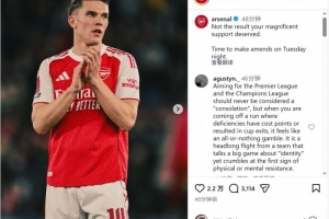 阿森纳官方社媒晒出球员们谢场的照片,配文:“你们的倾力支持没有换来应得的结果,周二晚上(客战葡体),我们会弥补这一切。”