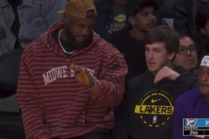 在聊高尔夫?詹姆斯和里夫斯在场边热疗 比划手势不像在聊篮球