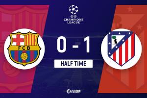 半场-马竞暂1-0巴萨 阿尔瓦雷斯任意球世界波破门库巴西直红