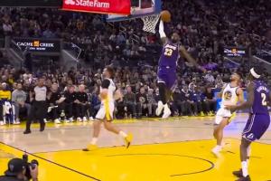 寒光凛凛似当年!詹姆斯反击踩着三分线起步超远距离单臂滑翔劈扣
