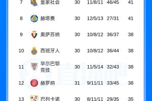 西甲积分榜:皇马2轮不胜先赛距榜首6分,巴萨将战西班牙人