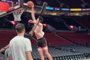 加油!杨瀚森赛前热身秀暴扣 与队友激情撞胸