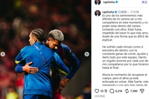 友谊赛受伤!拉菲尼亚发文:无法出战令我痛苦,为队友感到自豪