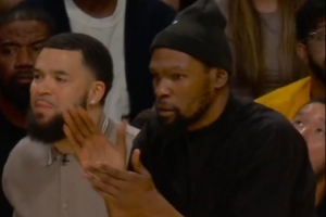 兄弟们冲!杜兰特和范弗里特化身啦啦队 在场边加油鼓劲