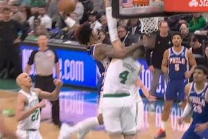 对飙扣篮!乌布雷单臂隔扣武切维奇 塔图姆变向切入双手暴力灌篮