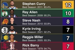 罚球命中率90+%命中率赛季数:库里12次历史最多 雷·阿伦10次