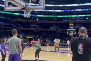 老头手感不错啊!老詹赛前投篮热身连中弧顶三分!