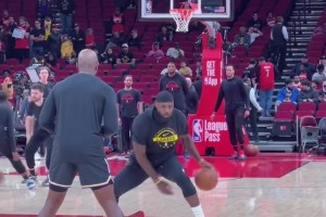 经典动作詹姆斯vs火箭赛前定点运球热身~