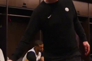 赛后库里将比赛用球送给科尔,祝贺科尔教练职业生涯第600次胜利.